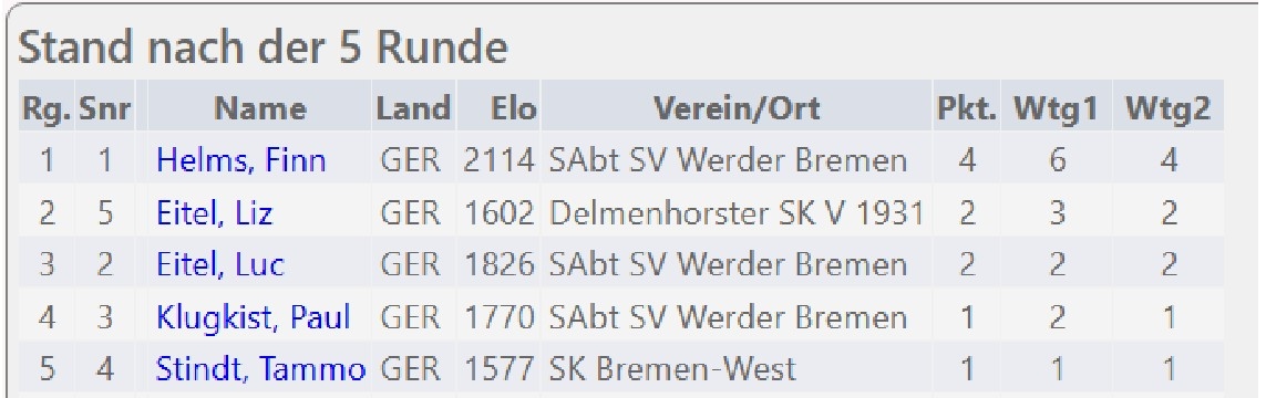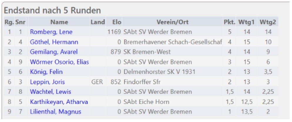 Bei den Jüngsten setzte sich die 7-jährige Lene Romberg von Werder Bremen souverän durch. Sie erfüllte ihre Favoritenrolle eindrucksvoll, gewann alle Partien und sicherte sich mit 5 Punkten den ersten Platz.