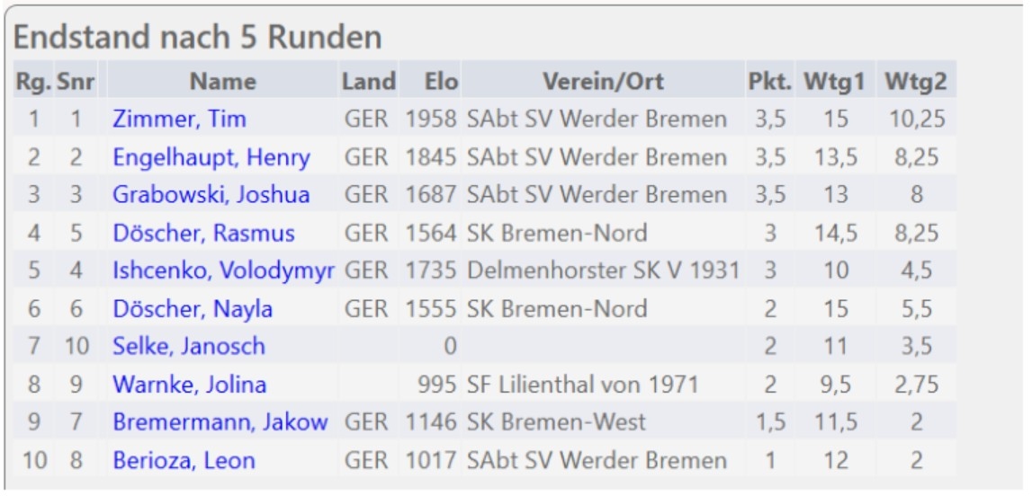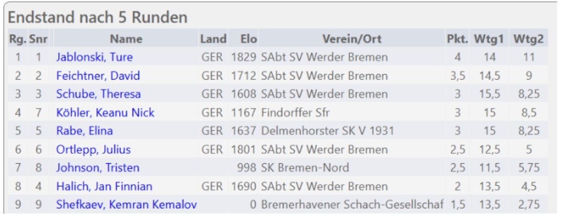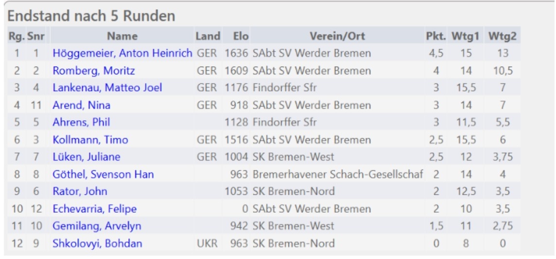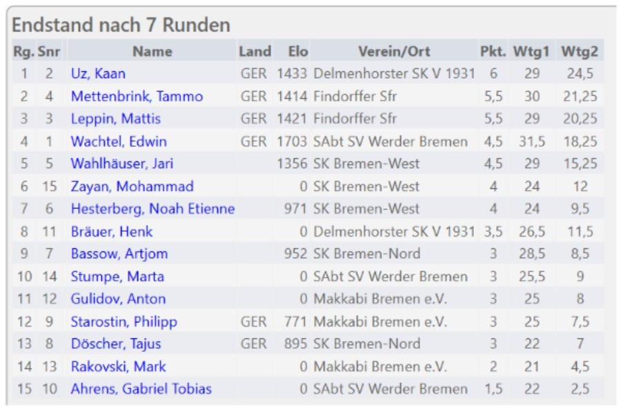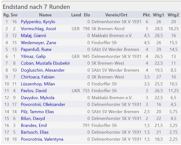 Am Ende setzte sich Kyrylo Pylypenko vom Delmenhorster SK mit starken 6 Punkten aus 7 Partien überzeugend durch. Auf den weiteren Plätzen folgten Joost Vormschlag (SK Bremen Nord) und Gianni Malaj (Makkabi Bremen).