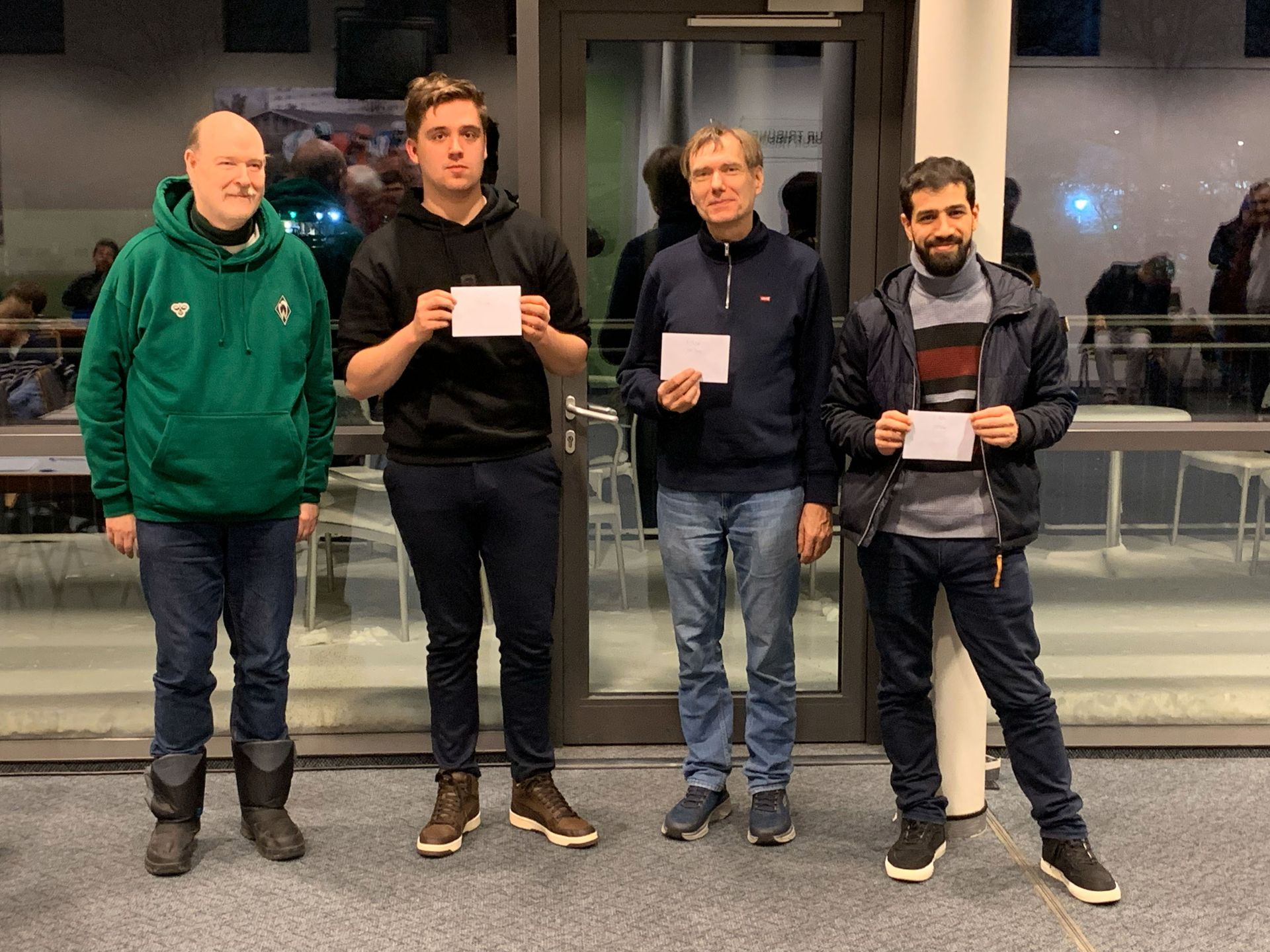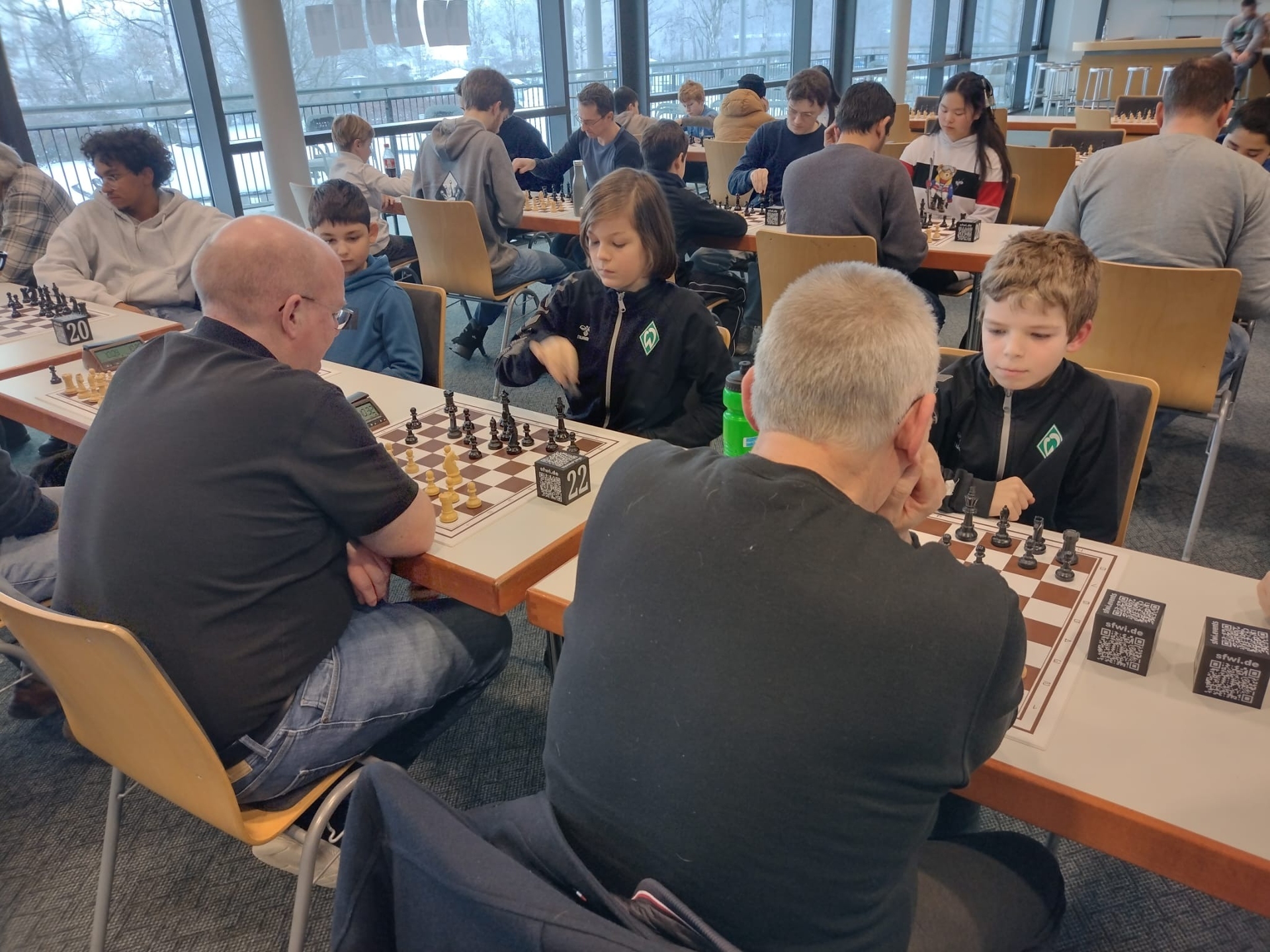 Das war ein voller Erfolg – und das nicht nur organisatorisch. Aufgrund des Wintereinbruchs mit extrem viel Schnee und Eis in Bremen reduzierte sich die Teilnehmerzahl am Turniertag von ursprünglich über 80 angemeldeten Spielerinnen und Spielern auf 65. Diese sorgten über neun Runden Schnellschach dennoch für ein echtes Schachfest an den Brettern, mit spannenden Partien, überraschenden Wendungen und vielen starken Leistungen aus grün-weißer Sicht.